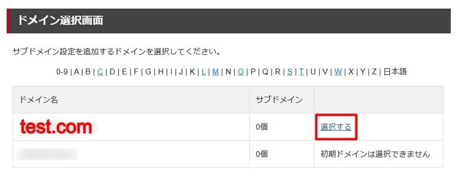 サブドメインを追加したい独自ドメインの「選択する」を選んでください。