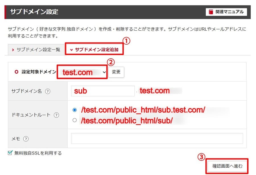 - 「設定対象ドメイン」でサブドメインを追加した独自ドメインを選択する