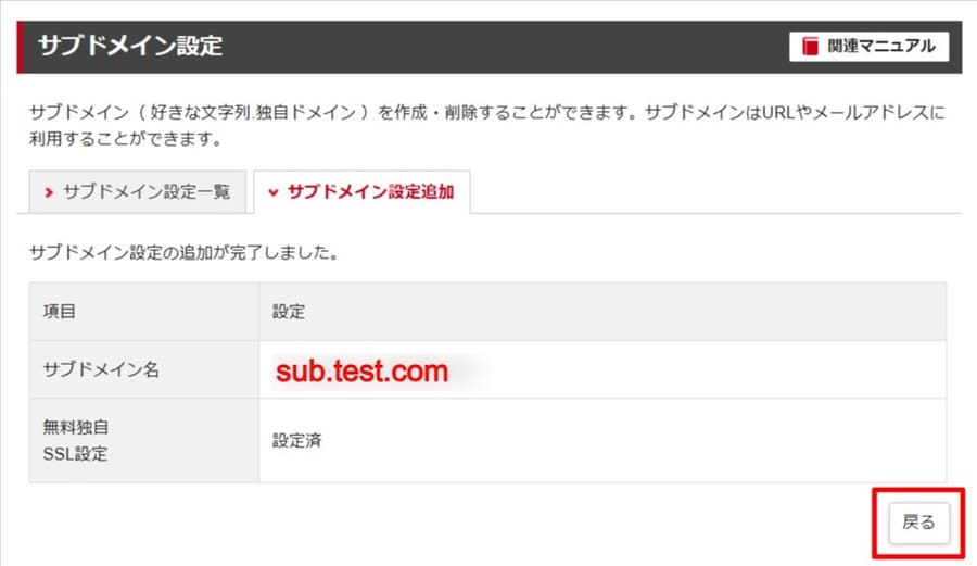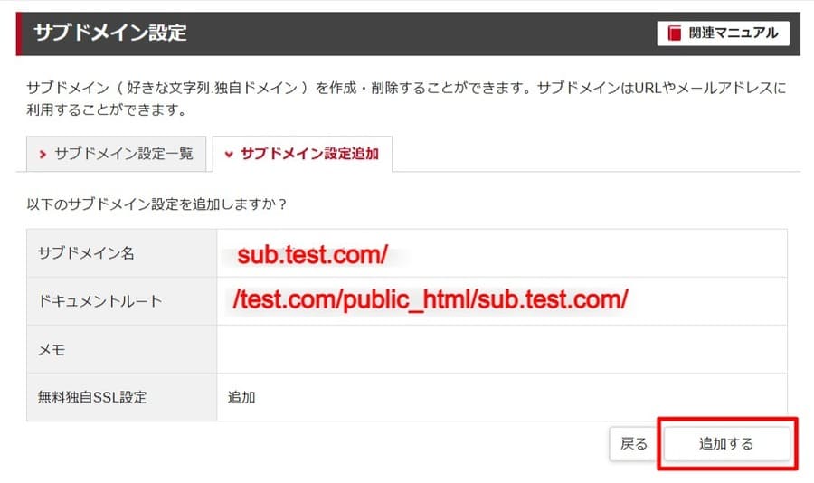 サブドメインの設定内容に問題がなければ「追加する」ボタンを選択します。