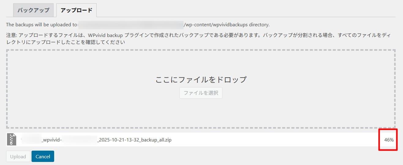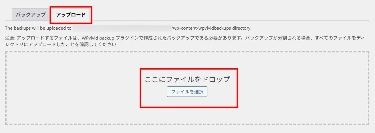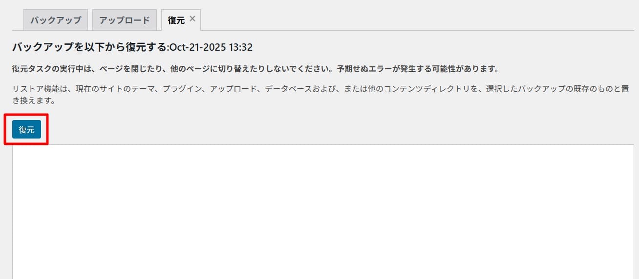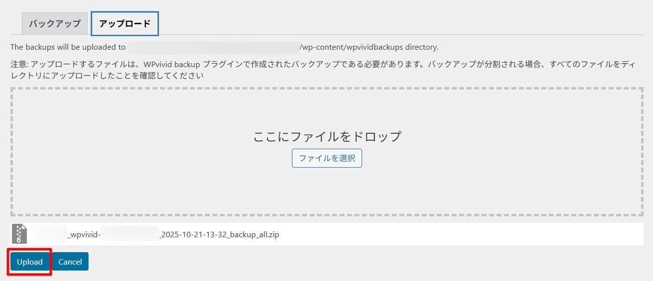 バックアップファイル名と共に「Uploadボタン」が表示されるので、ボタンを選択します。