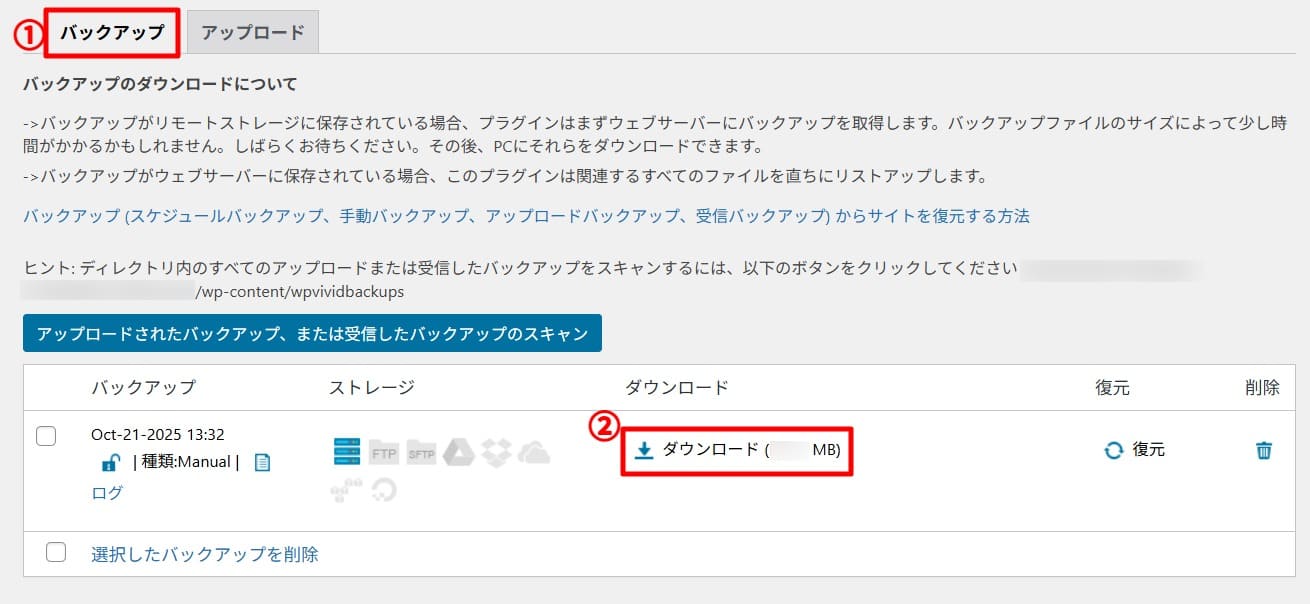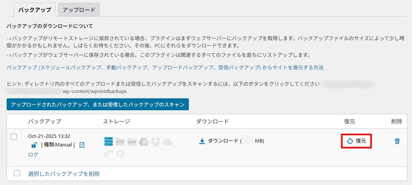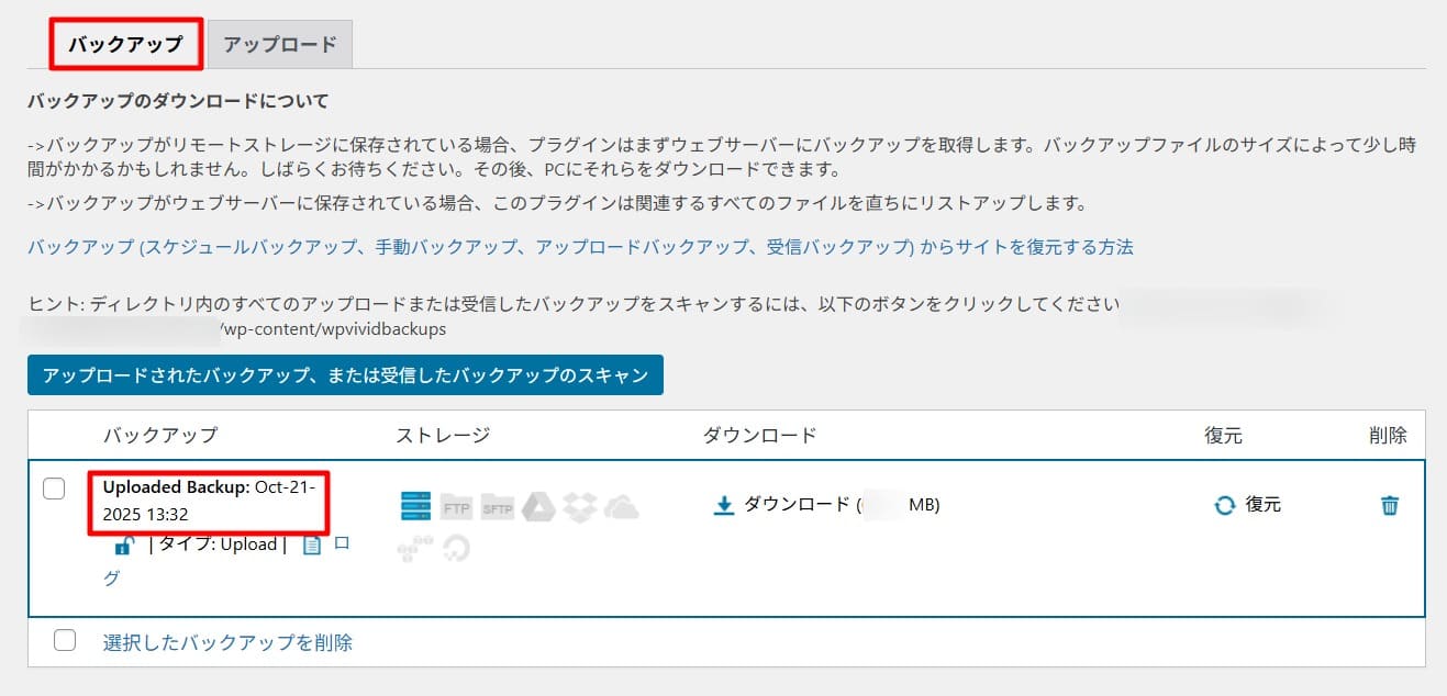 アップロードが完了すると、上図になり「ダウンロード、復元、削除」から操作可能になります。