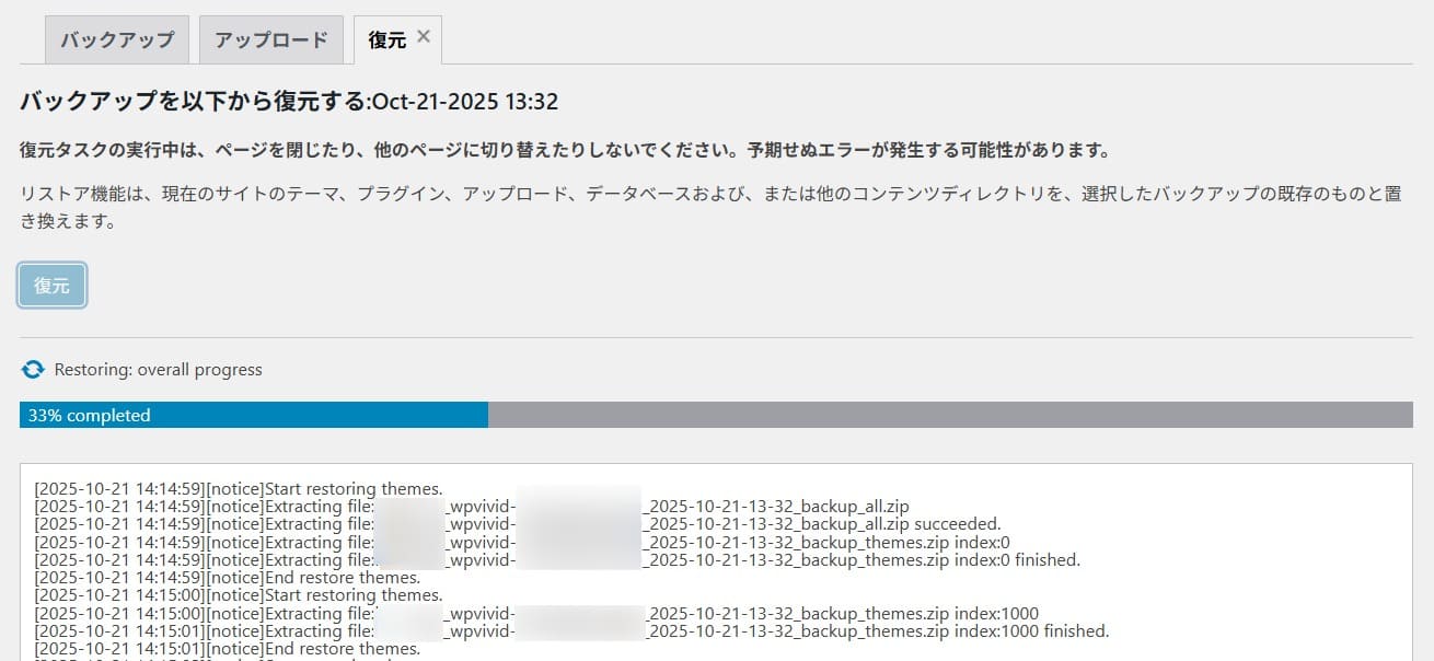 完了すると「復元が完了しました。」とメッセージが出力されます。